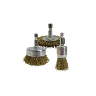 The Brumby 3 Piece Wire Brush Kit for drills contains an assortment of brass-coated steel wire brushes. They are easy to use as each brush is spindle-mounted and can be directly mounted onto your drill no arbor required. The brushes are all ideal for deburring applications, rust and paint removal, cleaning, edge blending and surface preparation. All wire brushes in the kit feature crimped brass coated steel wire. This type of wire provides high tensile strength and cutting performance, and is commonly used for demanding brushing and deburring applications. This type of wire, not to be confused with brass wire, is suitable for use on steel, brass, iron, plastics and wood. The kit contains the following items: 1 x 50mm Spindle-Mounted Cup Brush 1 x 50mm Spindle-Mounted Wheel Brush 1 x 25mm Spindle-Mounted Hex Brush