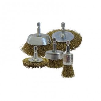 The 5 piece Brumby Wire Brush Kit offers a comprehensive range of wire brushes for drills. All fitted with a spindle, they can be directly mounted onto your drill. It is an ideal brush kit for deburring, rust and paint removal, cleaning, blending and surface preparation. All wire brushes in the kit feature crimped brass coated steel wire. This type of wire provides high tensile strength and cutting performance, and is commonly used for demanding brushing and deburring applications. This type of wire, not to be confused with brass wire, is suitable for use on steel, brass, iron, plastics and wood. The kit contains the following items: 1 x 50mm Spindle-Mounted Cup Brush 1 x 50mm Spindle-Mounted Wheel Brush 1 x 25mm Spindle-Mounted Hex Brush 1 x 75mm Spindle-Mounted Cup Brush 1 x 75mm Spindle-Mounted Wheel Brush