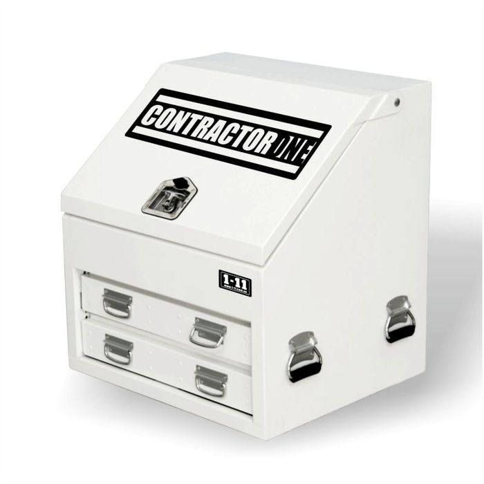 DESCRIPTION The original heavy duty BKAT / ContractorOne steel truck box - 700mm wide CONTRACTORONE - "The original one & only BKAT truck boxes". These truck / ute boxes are designed and manufactured TOUGH. The perfect heavy duty work box to suit your vehicle and application. A Premium Quality Truck Box, and when you choose a ContractorOne BKAT box you know are getting a great product every time. Designed to suits all types of trades people and the back of work vehicles. Steel powder coated ripple white and UV stable the boxes are ideal for trades people, builders, carpenters, plumbers, electricians, farming, forestry, mining, construction, local government and much more. A serious toolbox. SPECIFICATIONS: Overall Dimensions: Width: 700mm Depth: 600mm Height: 750mm Weight: 70kg FEATURES: - White powder coated ripple finish - UV stable - 2x large drawers with sealed bearing slides (100kg rating per drawer) - Internal locking pin to secure drawers - 2x rear fixed shelves - welded - 2x gas struts - 4x heavy duty handles - 1x T-handle Lock - Built ultra tough for Australian conditions. - Ideal for mobile service personnel, mining & agricultural industries - Huge capacity for mobile tradespersons - Ideal for the back of vehicles / trays etc. - Weatherproof DELIVERY INSTRUCTIONS: A forklift is required to unload this item