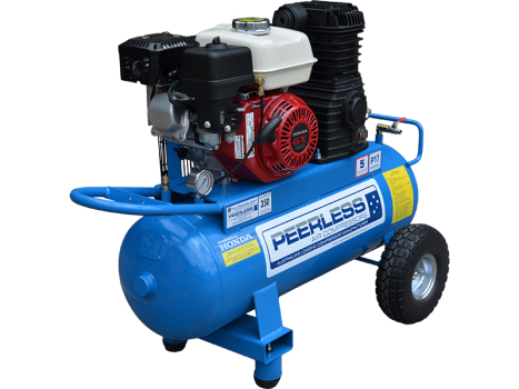 TECHNICAL SPECIFICATIONS FREE AIR DELIVERY (F.A.D)350 LPM @ 100PSI CYLINDERS2 MAX PSI145 MOTORHonda GX200 PUMPN75 PUMP RPM1061 TANK SIZE55 L DIMENSIONS (L X W X H)1100mm x 500mm x 850mm WEIGHT85kg PORTABLE / STATIONARYPortable The P17 petrol has become the largest selling model due to its performance of 350 litres of free air. This is the largest petrol model you can buy with a 6HP Honda engine. Again it is super quiet and efficient for the amount of air you receive. It will run die grinders, most common air sanders and 1/2 " impact guns. This unit is truly manufactured for the professional. Electric start optional extra. Please call Peerless for a quote. Electric start engine does not come with battery, leads or provisions for battery. We can manufacture to your design plus there are other standard designs for each model.