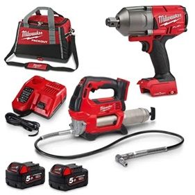 Includes 1 x MILWAUKEE 18V FUEL ONE-KEY Brushless 3/4" High-Torque Impact Wrench Skin M18ONEFHIWF34-0 1 x MILWAUKEE 18V Cordless 2-Speed Grease Gun Skin M18GG-0 2 x Milwaukee 18V 5.0Ah Red Lithium-Ion Battery M18B5 1 x MILWAUKEE 12V/18V 4.5/6.0Ah Multi Voltage Rapid Charger M12-18FC 1 x PACKOUT Bag
