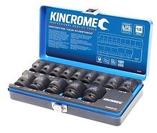Kincromes range of impact sockets are manufactured from Chrome Molybdenum (Cr-Mo) and feature a black phosphate finish for superior corrosion protection, laser etching for easy drive size identification and Peripheral Drive technology. Peripheral Drive provides greater torque by relocation the load to the flat sides of a fastener, this allows for greater surface area contact and prevents rounding off of fasteners. IMPORTANT: Only Impact Sockets should be used on air or electrically operated power tools. NEVER use silver Chrome Vanadium Steel (Cr-V) Sockets which can shatter and cause personal injury. CONTENTS 14 x 1/2" Drive Standard Impact Sockets 5/16, 3/8, 7/16, 1/2, 9/16, 5/8, 11/16, 3/4, 13/16, 7/8, 15/16, 1, 1-1/16, 1-1/8" EVA Tray for storage