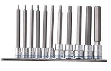 Manufactured from heavy duty Chrome Vanadium Steel and conveniently supplied on a clip rail for easy storage. Socket Drive, Chrome Vanadium Steel Driving Bit Silicone Alloy Steel (S2) Contents: 1/4" Square Drive - 100mm: H1.5, H2, H2.5, H3, H4, H4.5mm 3/8" Square Drive - 100mm: H5, H6, H8, H10, H12mm