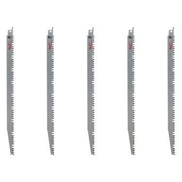 Milwaukee 305mm 5TPI Reciprocating Saw Blade for Wood Pruning - 5 Piece Features Extra deep gullets easily remove chips for fast cutting. Unique fleam ground teeth cut in both directions for clean cuts. Induction hardened teeth for long life Specifications Length: 305mm (12") Teeth per Inch (TPI): 5