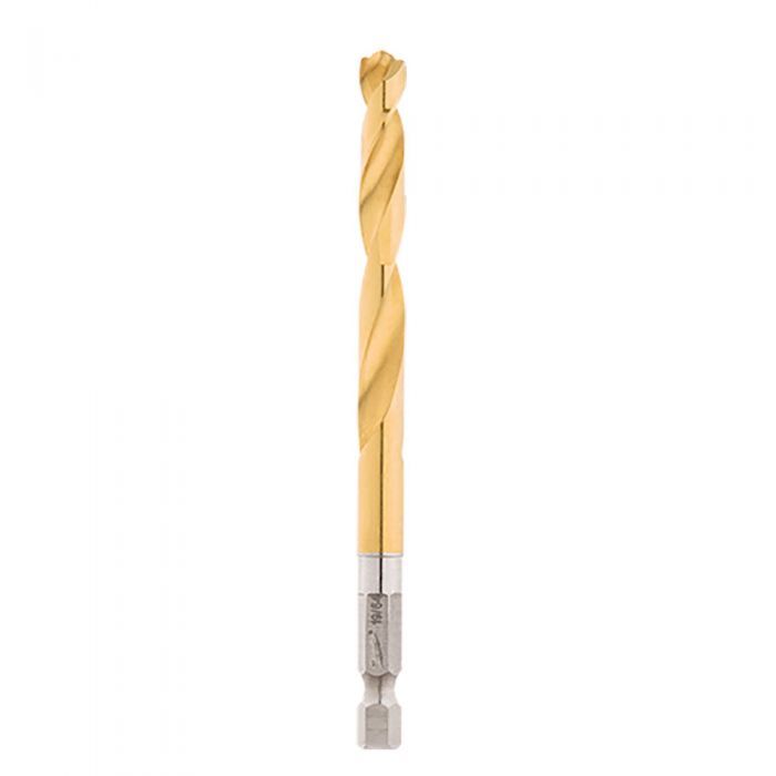 Milwaukee SHOCKWAVE Impact Duty Titanium Drill Bits with RED HELIX are engineered for impacts and drills. Designed with a Variable Helix with an aggressive 35° Helix Angle which ends at 15°, the Impact Duty Titanium Drill bits with RED HELIX provide Rapid Chip Removal to limit heat buildup to Stay Sharper Longer. The 135° split point tip delivers a precision start and prevents walking for fast, accurate holes. Titanium coating can be used in all drilling applications to give you up to 3X life vs. Black Oxide Drill Bits. 135° Split Point Tip - Drill bit starts engaging the material on contact for fast starts. Drill bit does not walk across material. Variable Helix - Provides a solution to cutting vs clearing material removal problem. Allows for fast and efficient material ejection to reduce heat. Chip Breaker - Splits up the size of the material from the cutting edge. Cools the material faster by breaking it into small pieces. Productivity - Suitable for use in drills and impacts. Offers increased productivity when drilling and fastening.
