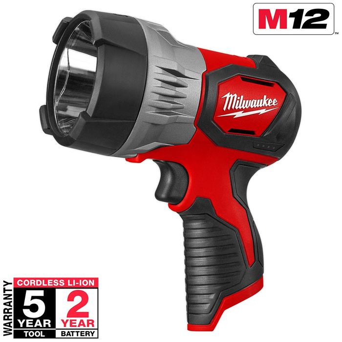 Spots Further, Lasts Longer The New TRUEVIEW M12 LED Spot Light gives professionals the most portable, high performance spotlight to illuminate, identify, and diagnose on and off the job site. The M12SLED has a beam distance of 640M, offering the ability to spot objects and areas a long distance away. It has high and a low output modes of operation for long distances, more clarity in closer situations, as well as a strobe mode for safety situations. The M12 LED Spot Light can run for up to 4 hours in its high mode with an M12 REDLITHIUM 4.0Ah Battery Pack, and up to 8 hours in low and strobe modes. The M12SLED is impact and water resistant to survive professional use, and it features an impact-resistant lens cover. Its high quality LED never needs to be replaced, and is backed by a limited lifetime warranty. FEATURES: The Milwaukee REDLITHIUM Battery Pack is the most durable pack on the market delivering more run-time, power and longer battery life. Metal housing and impact resistant polycarbonate lens with gasketed rubber cap which protects from moisture for harsh job site conditions Ergonomic grip with rubber overmold - enhances user comfort and grip during use Milwaukee designed reflector - produces narrow centre beam with wide peripheral beam Dual function trigger allows momentary or lock-on use