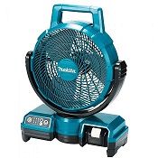 he Makita 18V 235mm Jobsite Fan is a portable and convenient air-moving solution for painters, contractors, and more. The fan has three-speed settings and an oscillation selector for optimal air velocity and control. When using an 18V LXT 6.0Ah battery (BL1860B, sold separately), users get up to 7 hours of continuous run time on the high-speed setting. Added features include tilt-settings for better direction of airflow. The 3-stage automatic timer has 1-hour, 2-hour and 4-hour power-off selection. The fan is compatible with 18V LXT batteries or AC power. The automatic oscillating fan increases airflow dispersion Powered by either 18V Li-ion batteries or AC power 190m/min maximum airspeed with 3 wind speed settings High / Medium / Low Off timer function with 1.2 and 4-hour settings Quiet running noise level of only 53dB due to redesigned fan blades Removable blade cover front cover is removable easily by removing a single screw, allowing users to efficiently clean the fan blades as they see necessary Adjustable fan angle fan head can be tilted up 90°and down 45° as well as 90° left and right Adjustable oscillation when selected the fan will automatically oscillate 45° left and right significantly increasing the air dispersion angle Specifications: Continuous runtime: 7 hours on High (6.0Ah battery) Fan diameter: 235mm (9-1/4") Max. wind velocity: 190m/min Max. air volume: 8.2m/min