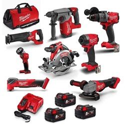 Includes 1 x MILWAUKEE 18V FUEL 13mm Hammer Drill/Driver Skin M18FPD30 1 x MILWAUKEE 18V FUEL 1/4" Hex Impact Driver Skin M18FID30 1 x MILWAUKEE 18V FUEL Brushless 125mm Angle Grinder w. Deadman Paddle Switch Skin M18FAG125XPD-0 1 x MILWAUKEE 18V FUEL SAWZALL Reciprocating Saw Skin M18CSX2-0 1 x MILWAUKEE 18V 165mm Fuel Circular Saw Skin M18CCS55-0 1 x MILWAUKEE 18V FUEL 26mm SDS Plus Rotary Hammer Skin M18FH-0 1 x MILWAUKEE 18V FUEL Brushless Oscillating Multi-Tool Skin M18FMT-0 1 x MILWAUKEE 18V LED Torch Skin M18TLED-0 3 x MILWAUKEE 18V 5.0Ah Red Lithium-Ion Battery M18B5 1 x MILWAUKEE 12V/18V Multi Voltage Rapid Charger M12-18FC 1 x MILWAUKEE Contractor Bag