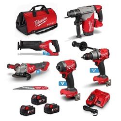 Includes 1 x MILWAUKEE 18V FUEL ONE-KEY 13mm Hammer Drill/Driver Skin M18ONEPD30 1 x MILWAUKEE 18V FUEL ONE-KEY 1/4" Hex Impact Driver Skin M18ONEID30 1 x MILWAUKEE 18V Brushless 28mm SDS Plus Rotary Hammer Skin M18FHP-0 1 x MILWAUKEE 18V FUEL ONE-KEY 125mm Angle Grinder Skin M18ONEFAG125XPDB-0 1 x MILWAUKEE 18V FUEL ONE-KEY SAWZALL Reciprocating Saw Skin M18ONESX2-0 3 x MILWAUKEE 18V 5.0Ah Red Lithium-Ion Battery M18B5 1 x MILWAUKEE 12V/18V 4.5/6.0Ah Multi Voltage Rapid Charger M12-18FC 1 x MILWAUKEE 230mm The WRECKER w/ Carbide Teeth - 1 Piece 48005242 2 x Side Handle 2 x Belt Clips 2 x Bit Holders 2 x Vent Clips 1 x Contractor Bag