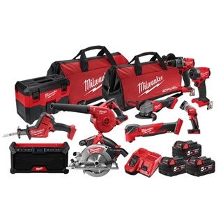 Features: POWERSTATE Brushless Motor: Outpowers all other 18-volt cordless circular saws and provides longer tool life REDLINK PLUS Intelligence: The most advanced electronic system on the market maximises performance Inclusions: 1) M18FPD30 - M18 FUEL GEN 4 13mm Hammer Drill/Driver (Tool Only)? (1) M18FID30 - M18 FUEL GEN 4 1/4" Hex Impact Driver (Tool Only)? (1) M18TLED-0 - M18 LED Work Light (Tool Only)? (1) M18FHZ-0 - M18 FUEL HACKZALL Reciprocating Saw (Tool Only)? (1) M18BBL-0 - M18 Compact Blower (Tool Only)? (1) M18FAG125XPD-0 - M18 FUEL 125 mm (5") Angle Grinder with Deadman Paddle Switch (Tool Only)? (1) M18CCS5520 - M18 FUEL 165mm Circular Saw (Tool Only) ? (1) M18FMT-0 - M18 FUEL Multi-Tool (Tool Only)? 1. M18JSSP20 - M18 Bluetooth Jobsite Speaker (Tool Only) ? (1) M18WDV-0 - M18 7.5 Litre Wet/Dry Vacuum (Tool Only)?(3) M18B5 - M18 REDLITHIUM 5.0Ah Battery ?(1) M12-18FC - M12 & M18 Rapid Charger?(2) M18 FUEL Contractor Bag?