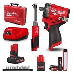 Includes 1 x MILWAUKEE 12V 1/2" Stubby Impact Wrench with Friction Ring Skin M12FIW2F120 1 x MILWAUKEE 12V FUEL 3/8inch High Speed Extended Reach Ratchet Skin M12FHIR38LR0 1 x MILWAUKEE 10 Piece 3/8 Inch Drive Standard Metric Socket Set with Storage Rail 48229503 1 x MILWAUKEE REDLITHIUM 3.0Ah USB Rechargeable Pocket Flood Light Kit L4FL301 1 x MILWAUKEE 12V RedLithium-Ion 2.5Ah High Output Battery M12HB2 1 x MILWAUKEE 12V RedLithium-Ion 5.0Ah High Output Battery M12HB5 1 x MILWAUKEE 12V Battery Charger C12C 1 x MILWAUKEE M12 FUEL Carrying Case