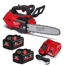 Includes 1 x MILWAUKEE 18V FUEL 305mm (12") Top Handle Chainsaw Skin M18FTCHS120 2 x MILWAUKEE 18V 8.0Ah REDLITHIUM-ION High Output Battery M18HB8 1 x MILWAUKEE 12V/18V 4.5/6.0Ah Multi Voltage Rapid Charger M12-18FC MILWAUKEE 18V FUEL 305mm (12") Top Handle Chainsaw Skin M18FTCHS120 The 18V FUEL 12" (305 mm) Top Handle Chainsaw provides users with fast cut speeds and the power to cut hardwoods, while eliminating the headaches associated with petrol engines. The chainsaw is designed to meet the performance, durability, and ergonomic needs of the professional arborist, power utility linesmen, and landscape maintenance professional. 18V FUEL technology allows the saw to reach full throttle in under 1 second, providing the user ultimate control and fast application speed. The POWERSTATE Brushless Motor maintains speed under heavy loads without bogging down. The chainsaw eliminates the headaches associated with petrol engines, such as pull starts, high noise levels, emissions, and regular engine maintenance. The REDLINK PLUS Intelligence enables full-circle communication between the tool and battery, providing the user with maximum levels of performance, protection, and productivity. Optimised for REDLITHIUM-ION HIGH OUTPUT batteries, when paired with an 8.0Ah battery (sold separately), the saw delivers up to 150 cuts per charge in 4" x 4" (102 mm) cedar. The saw has a professionally demanded feature set including an easy access chain tensioner, automatic oiler, metal bucking spikes, onboard scrench storage, lanyard loop, and climbing scabbard. POWERSTATE Brushless Motor delivers the power to complete cuts in demanding applications providing up to 2.1 kW of peak power and 3.2 Nm of peak torque Optimised for REDLITHIUM-ION HIGH OUTPUT batteries, delivering up to 150 cuts per charge with a 8.0Ah battery in 4" x 4" (102 x 102 mm) cedar Completes the demanding applications of petrol top handle chainsaws, without headaches associated with petrol engines Onboard scrench storage Variable speed trigger increases user control Easy access chain tensioner allows for quick adjustments to the cutting system Metal bucking spikes allow for increased leverage and control during applications Climbing scabbard fully covers bucking spikes, locks on to saw, and has tie off points for aerial applications Translucent oil reservoir allows for clear visibility to oil levels No pull starts, low noise, no emissions when in use, no mixing petrol and oil, and no regular engine maintenance Specifications Platform: 18V FUEL Bar Length: 12" (305 mm) Chain Gauge: 0.043" (1.1 mm) Chain Pitch: 0.325" (8.3 mm) Low Profile Drive Links: 51 Trigger: Variable Speed MILWAUKEE 18V 8.0Ah REDLITHIUM-ION High Output Battery M18HB8 Our 18V REDLITHIUM-ION HIGH OUTPUT 8.0Ah Battery Pack provides you with 50% more power and runs 50% cooler vs our other 18V REDLITHIUM-ION battery packs. The optimised combination of smaller size and increased power of the 18-volt battery provides you with a great solution for the entire range of 18V products. The lithium-ion battery delivers fade-free power and runs substantially cooler through heavy applications, allowing you to push your cordless power tools throughout a wide application range. The 18V 8.0Ah battery provides you with increased power in extreme-cold weather conditions (below -18°C) and delivers more work per charge, driving corded replacement. The REDLITHIUM-ION HIGH OUTPUT 8.0Ah extended capacity battery is fully compatible with all 150+ Milwaukee 18V solutions. REDLINK PLUS Intelligence: Our battery circuitry provides optimised performance and overload protection using total system communication between tool, battery and charger Fuel gauge on board: Displays remaining run-time Compatible with all 18V tools Best-in-class construction: offers long-lasting performance and the best protection against jobsite, weather and environmental conditions Versatility: powers all 150+ 18V cordless solutions MILWAUKEE 12V/18V 4.5/6.0Ah Multi Voltage Rapid Charger M12-18FC The 18V & 12V Rapid Charger charges packs up to 40% faster, reducing downtime and maximising productivity. The charger accepts all M18 and M12 batteries, providing an upgrade for both systems. Featuring REDLINK Intelligence, it communicates directly with the battery to monitor cell voltage, temperature, and charge status to optimise the performance and extend the life of the pack. As an added level of communication, the charger indicates when the battery reaches an 80% charge, providing confidence that a substantial amount of work can be completed without waiting for a full charge. Charges batteries up to 40% faster Charges all 12V and 18V batteries Sequential charging: automatically charges the second inserted pack once the first pack is fully charged REDLINK Intelligence: charger communicates with the battery pack to ensure optimum performance and extend life 18V REDLITHIUM-ION 2.0 Ah / 4.0 Ah / 5.0 Ah / 6.0 Ah / 9.0 Ah battery packs recharge in 26 min / 47 min / 59 min / 68 min/ 95 min or less 12V REDLITHIUM-ION 2.0 Ah / 3.0 Ah / 4.0 Ah / 6.0 Ah battery packs recharge in 28 min / 45 min / 57 min / 90 min or less Specifications Platform: 12V Charge Time: 2.0Ah: 26 minutes 4.0Ah: 47 minutes 5.0Ah: 59 minutes 6.0Ah: 75 minutes 9.0Ah: 90 minutes