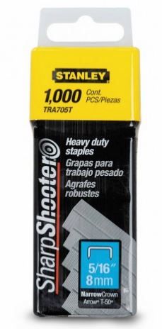 This 1,000-pack of 8mm heavy-duty narrow crown staples are convenient and reliable. Used for heavy-duty stapling jobs such as insulation carpet underlay, and roofing felt, these staples come in sturdy plastic packaging to helps reduce breakage of the stick. With color-coded packaging, you can easily choose the correct brads for the project you are working on. Includes: 1000x Staples Features: For heavy duty stapling jobs such as insulation, carpet under laying and roofing felt Color-coded packaging makes size and product selection a cinch Sturdy plastic packaging reduces staple breakage Heavy Duty Narrow Crown fits TR100, TR200, TRE500 series, PHT150, PHT250 and Arrow T-50
